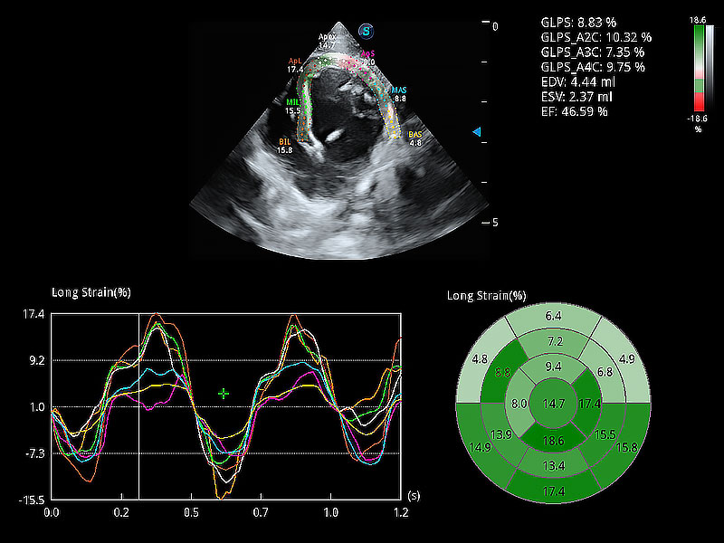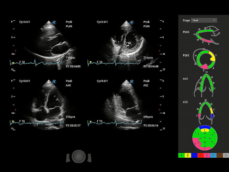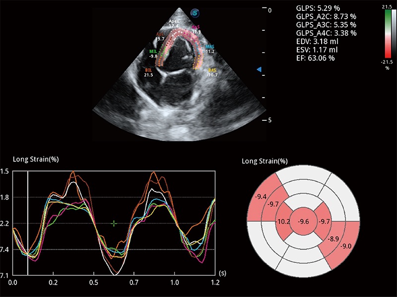 通過心肌識別技術(shù)與二維斑點追蹤技術(shù)相結(jié)合,對心臟的超聲圖像進行量化分析。計算心肌17個節(jié)段的應變、應變率、速度、位移等,并通過牛眼圖的形式進行呈現(xiàn)。