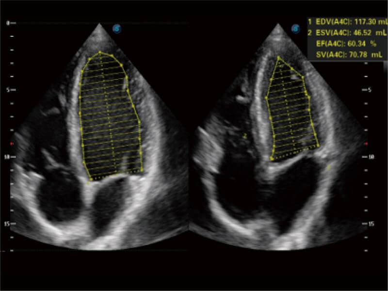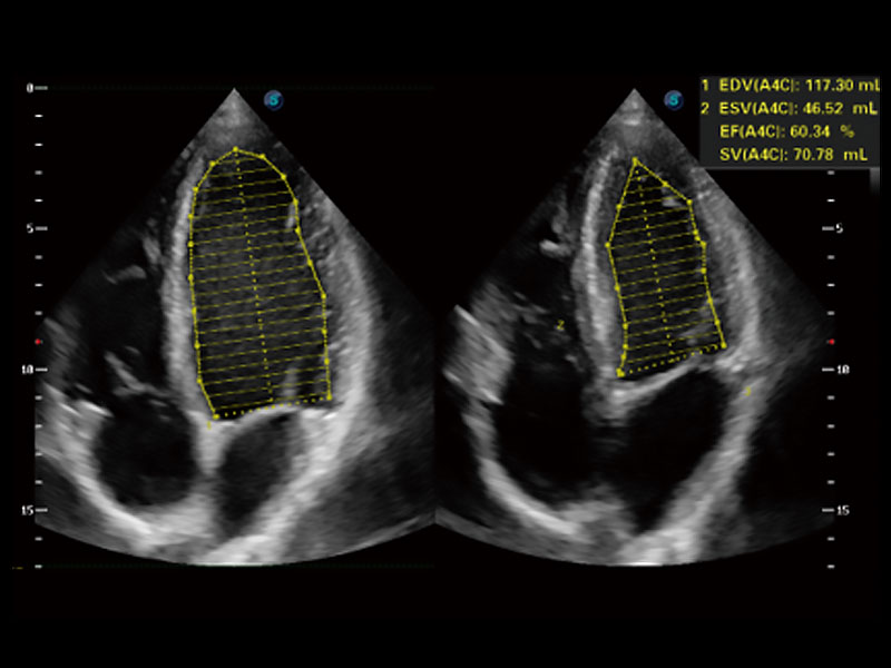 能夠基于左心室壁追蹤和辛普森法,自動計算射血分數(shù),支持多個可移動點描跡,與手動測量相比,極大節(jié)省了動物醫(yī)生的時間和精力。